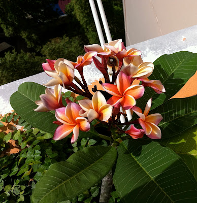 Thanks to the recent hot weather, my frangipani has finally bloomed after almost 5 years. The balcony does not usually get strong sunlight, only 4 hrs of morning light. I dislike the hot weather but the plants like it.